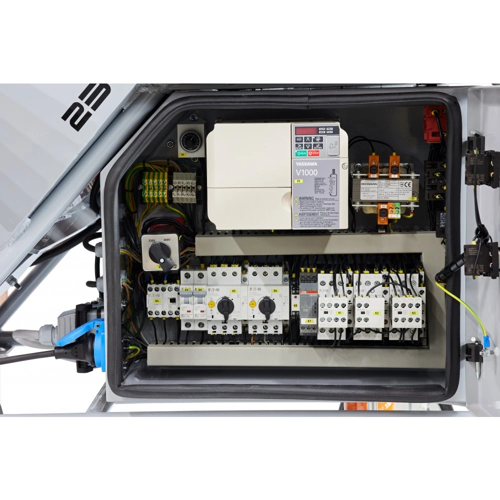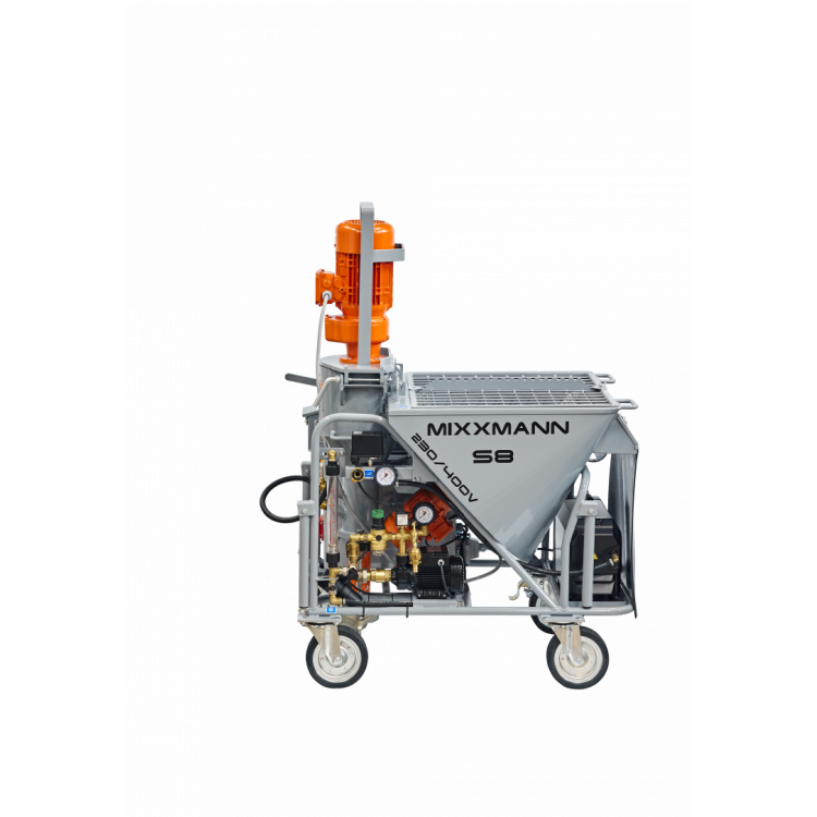 La stazione di intonacatura multitensione MIXXMANN S8 Reinforced può funzionare in modalità 230V o 400V. È destinato ai lavori con miscele edili a secco applicabili a macchina, come: intonaco di gesso, intonaco di calce-gesso, intonaco di cemento, intonaco di calce, intonaco di calce-cemento, malta per muratura, intonaco isolante, malta per pavimento colato.